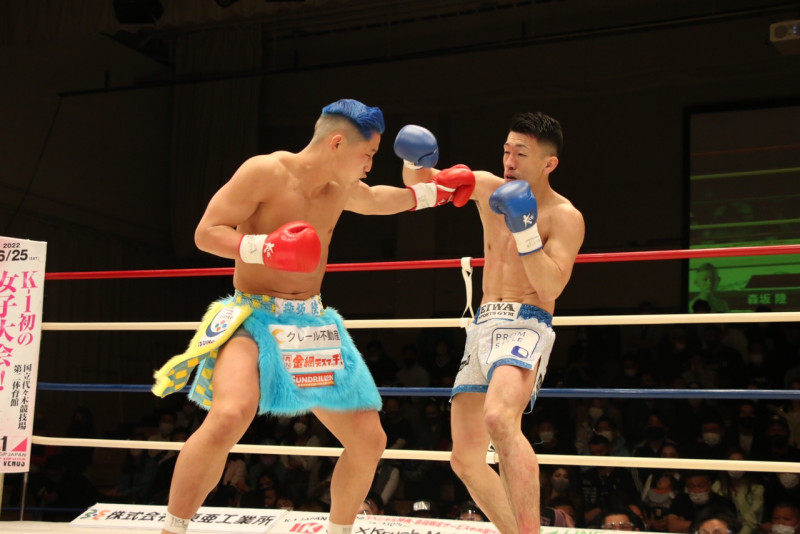 森坂(左)がバックブローでダウンを奪い、竹内を下した