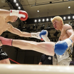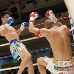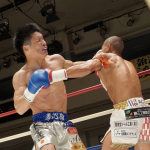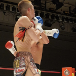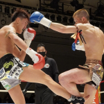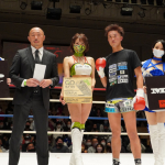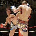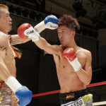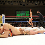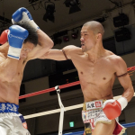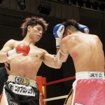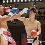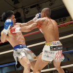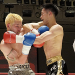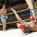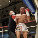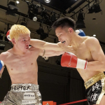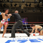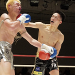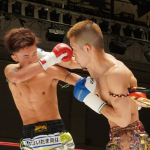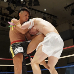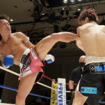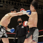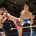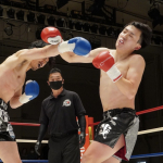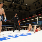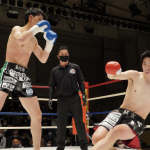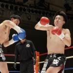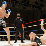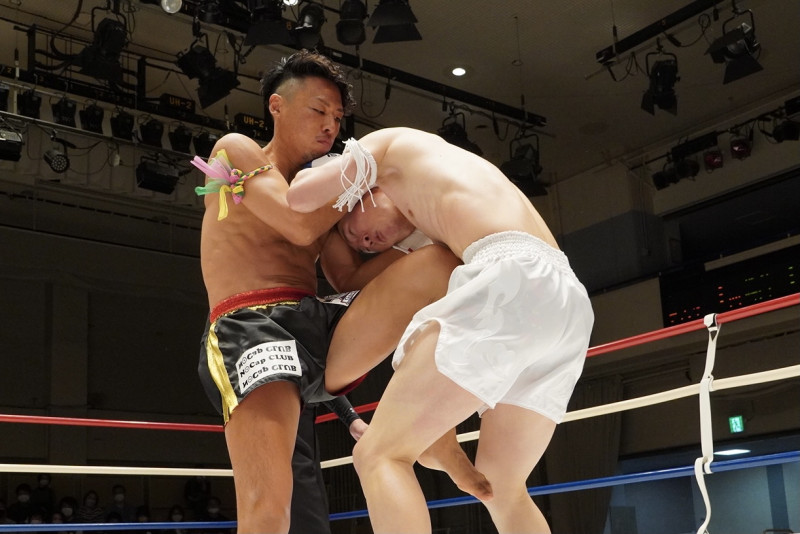 皆川がヒザ蹴り中心の攻撃を組み立てて勝利した