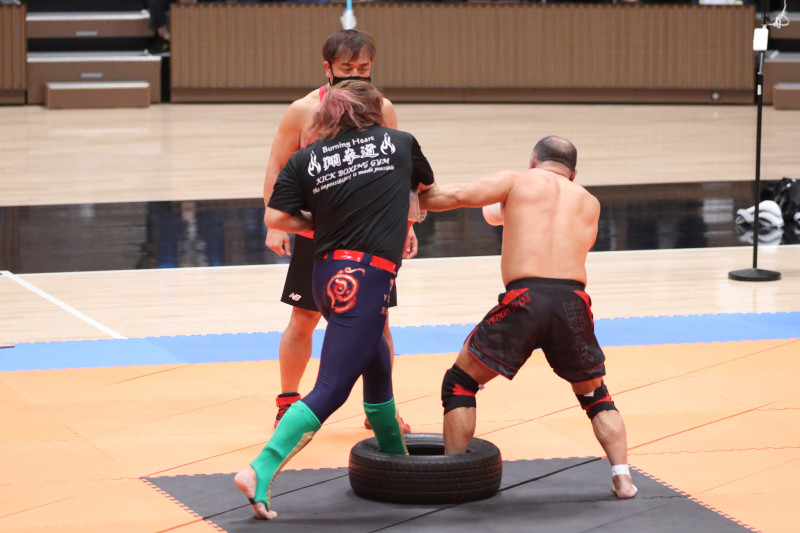 片足をタイヤに入れた「タイヤファイト」で内田の豪腕フックが炸裂