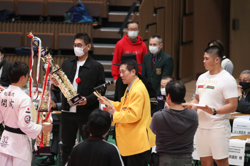 表彰式で極真護身空手の主催の浜井識安会長(黄色いブレザー)とスダリオ