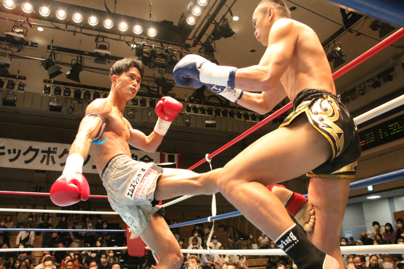 重森(左)はムエタイ王者を相手に互角の蹴り合いを見せた