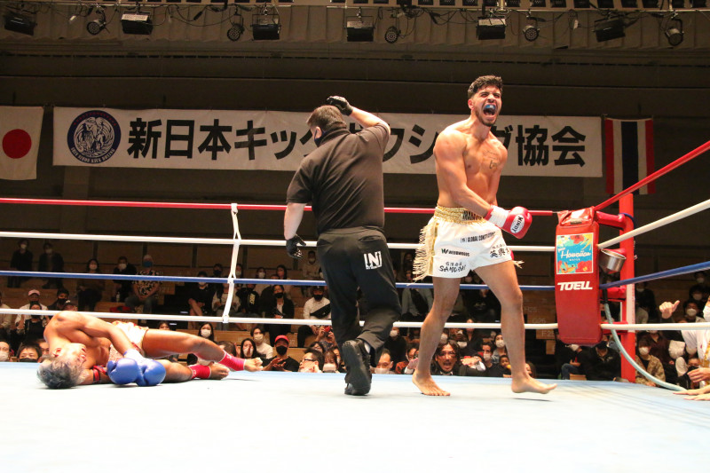 リカルド(右)は左ボディブロー一撃でカンボジアの強豪をKOした