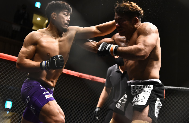 長岡(右)を下してベルトを獲得した川中(左)