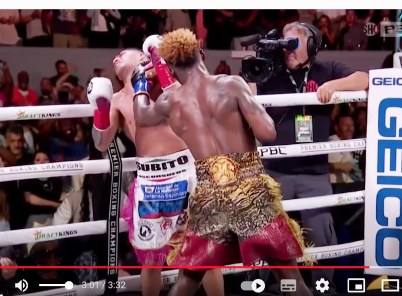 2度目のダウン。チャーロのこの左アッパーが決め手に。大きくアゴを上げる。(SHOWTIME Sports YouTube)