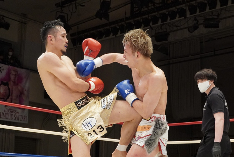 新美(左)のヒザ蹴りと玖村(右)のパンチが交錯
