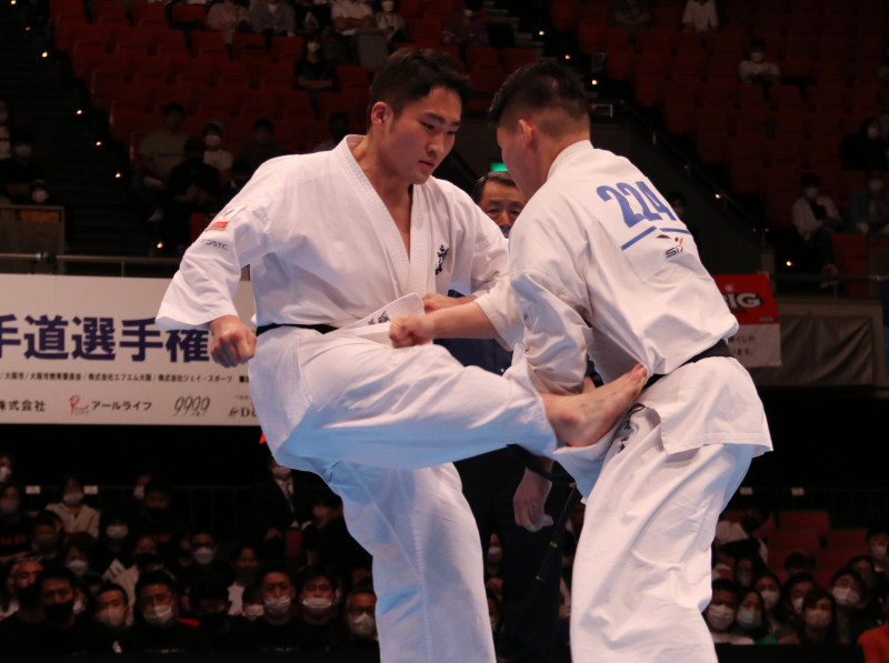 多田(左)が近距離の前蹴りを突き刺す