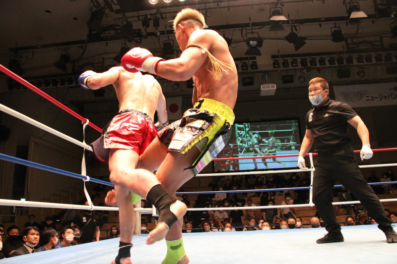洋輔はカーフキックでダウンを奪った
