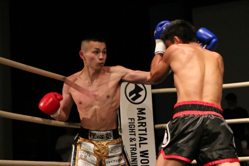 甲斐(左)がジョムラウィーを91秒でTKO!