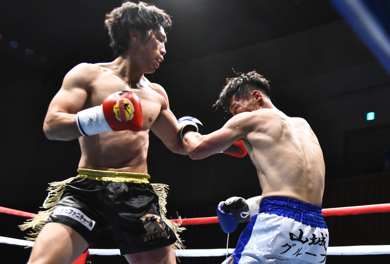 涼矢(右)からダウンを奪い判定勝ちした宮下(左)