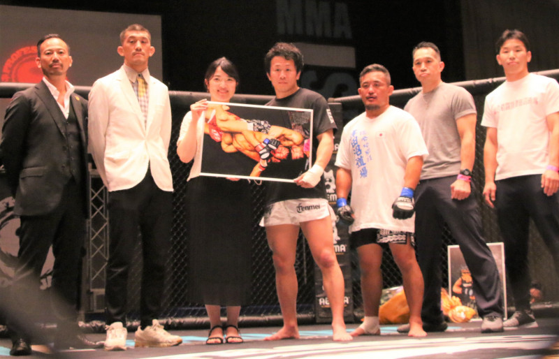 “激闘王”石橋が引退エキシビションを行った。試合後に家族や仲間と記念撮影