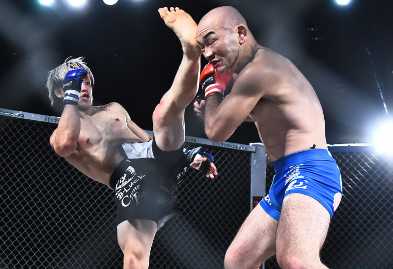Ryo(右)に左ハイを見舞う遠藤(左)