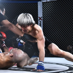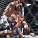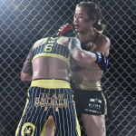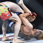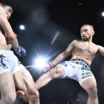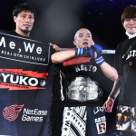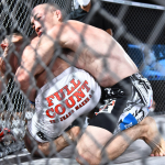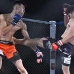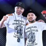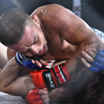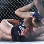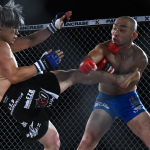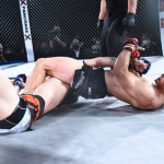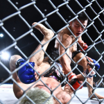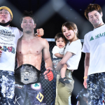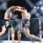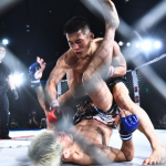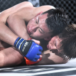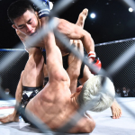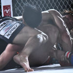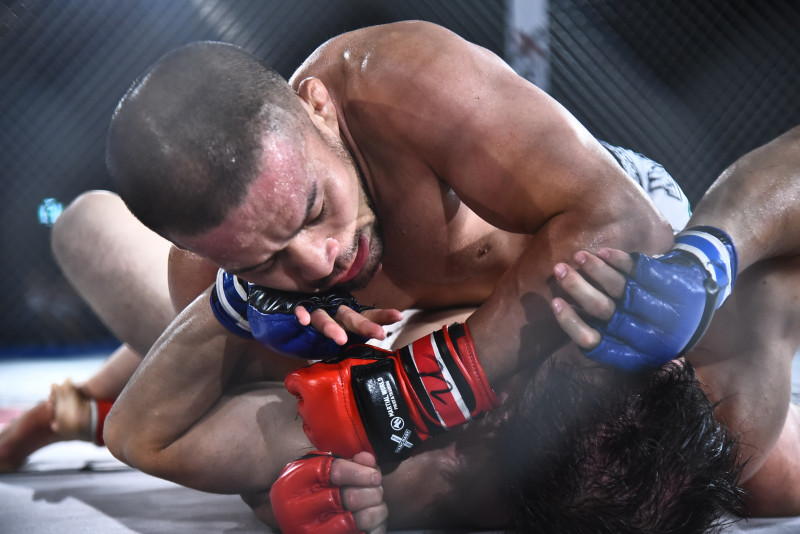グラウンドで佐々木(下)を圧倒しヒジで削っていく清水(上)