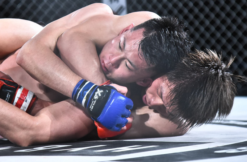 スリーパーホールドで一本勝ちしベルトを巻いた透暉鷹(右)
