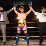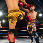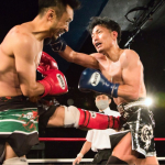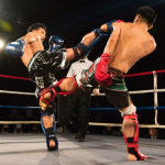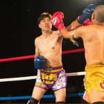 ナカザ(左)の右ハイキックに左ローを合わせる五城(右)