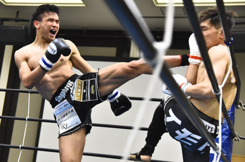 イモト(右)に強烈な左ミドルを見舞うシンパヤック(左)