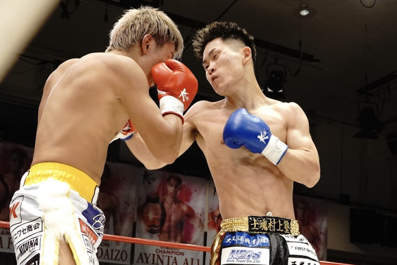 昇也(右)が気合のラッシュで攻め続け、KO勝利