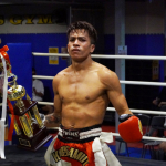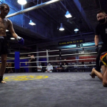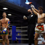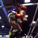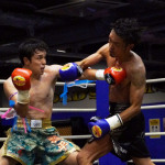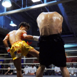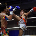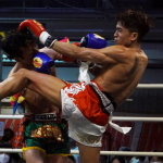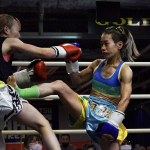 片島(右)がローキックを蹴る