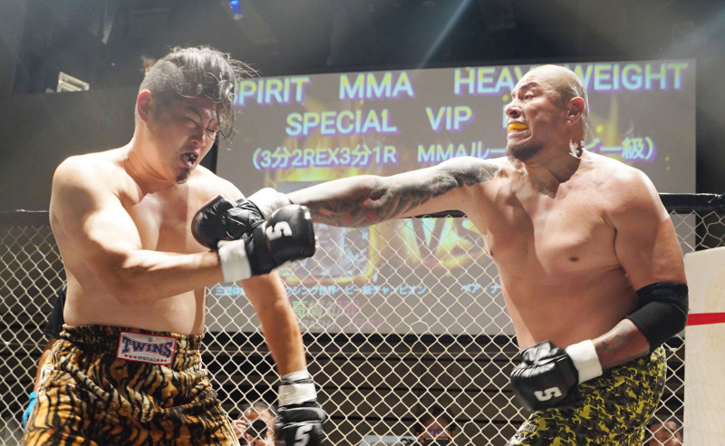 身長2メートルの長いリーチからパンチを放つメシア(右)