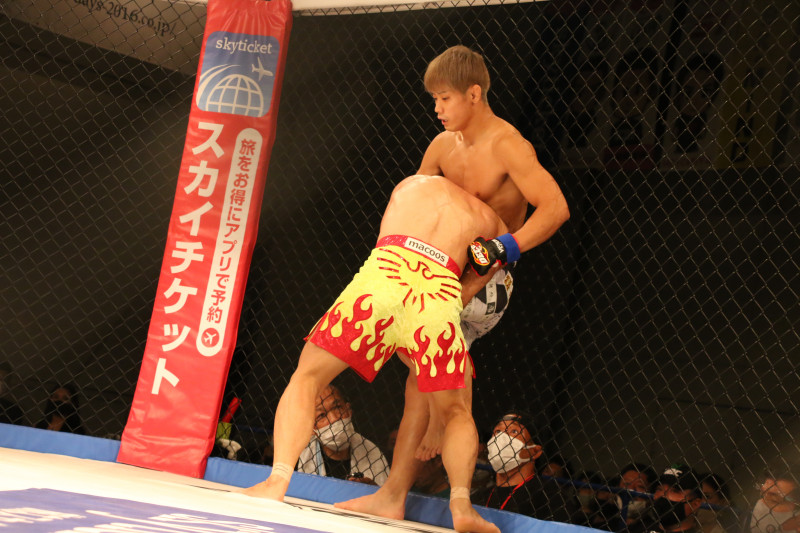 ボディロックした島袋に宇田がエルボーを落としてマットへ沈めた