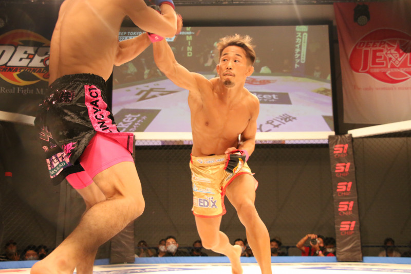 フライ級GP一回戦で村元(右)は風我(左)と打撃合戦となった