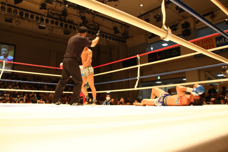 ヒジ打ちのダブルノックダウンとなり。馬渡がすぐに立ち上がってKO勝ちとなった
