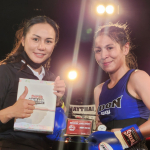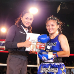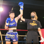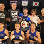 (後列中央)WMAチャンピオンベルトを巻いたクワンジャイ(前列左から)ブアンチョンプー、ナンホン、ナンシー