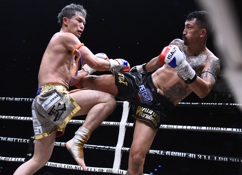 右ミドルを高橋(左)に見舞うパコーン(右)