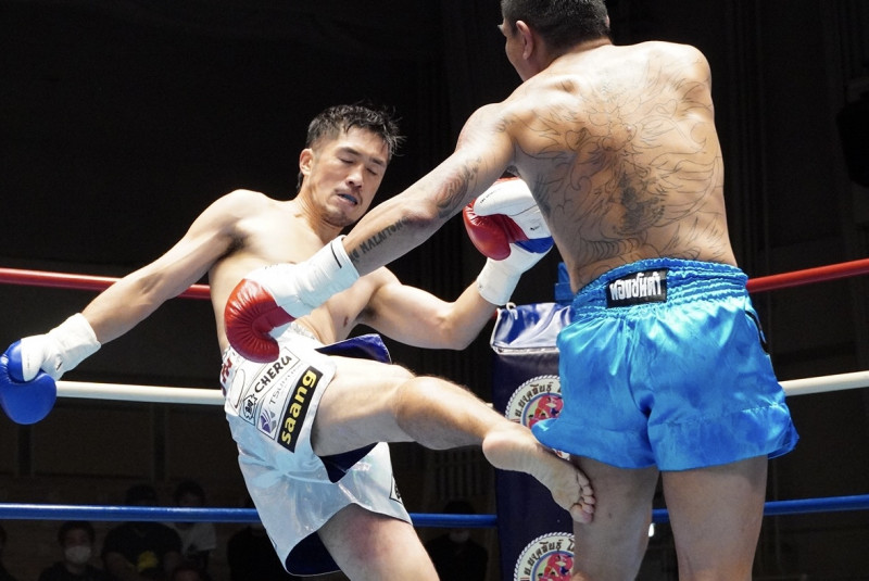 鈴木真治(左)の強烈な右ローキックが炸裂、この蹴りでダウン奪取