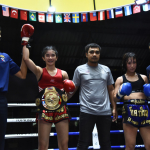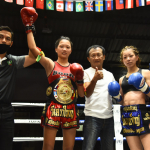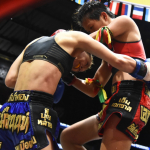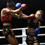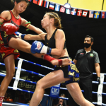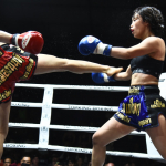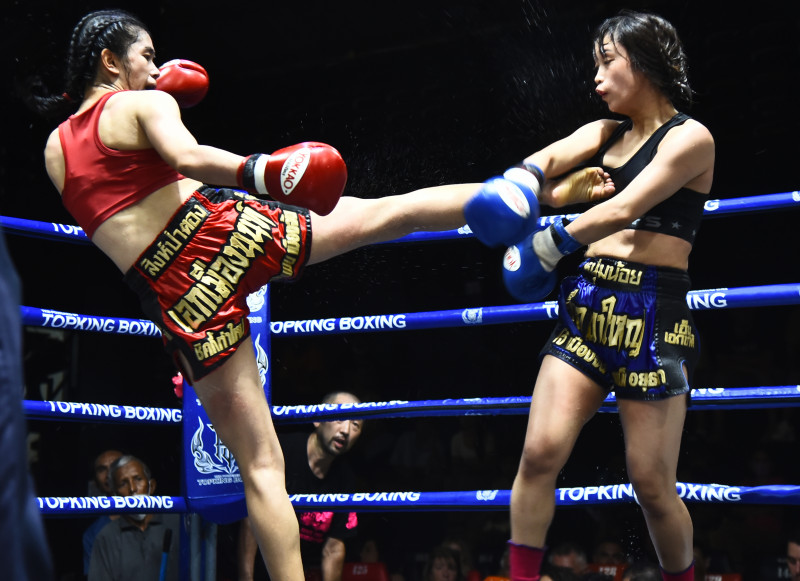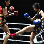 マングーペット(左)の右ミドルをもらうKAREN(右)