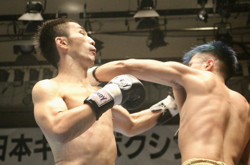 この左フックでKO勝利した王者・瀬戸口(左)