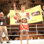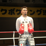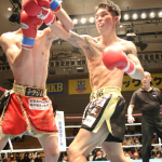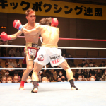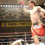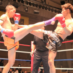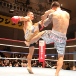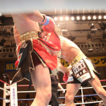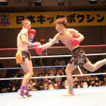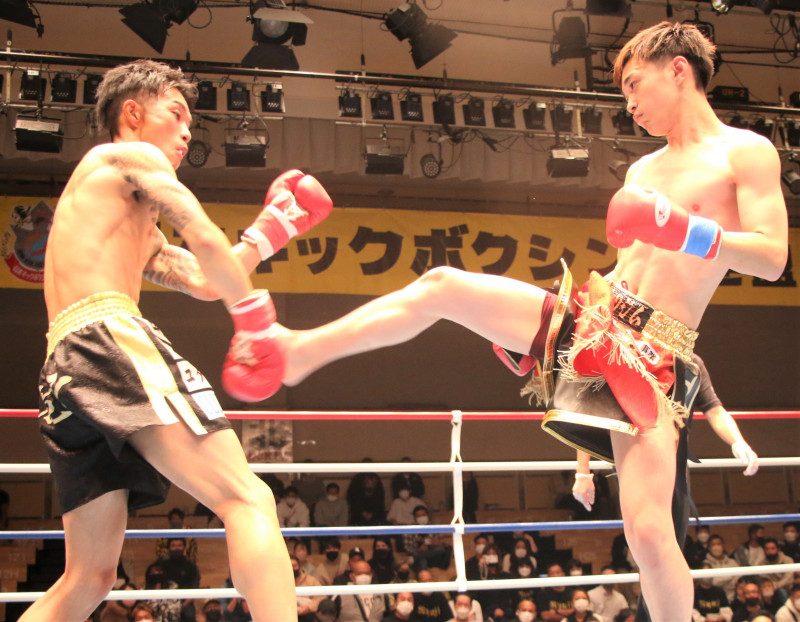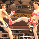 空手出身の森井(右)が、海老原(左)のボディへ何度も三日月蹴りを決めた