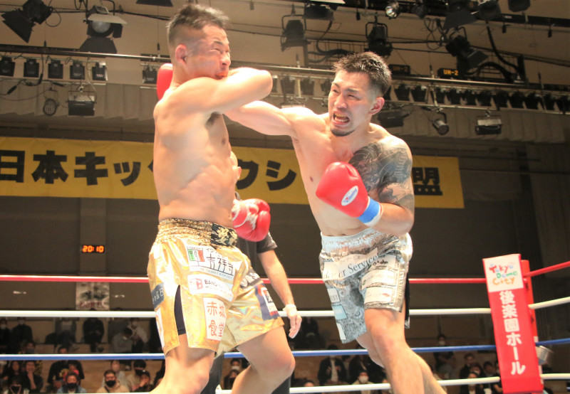 田村(右)が引退試合で釼田昌弘(左)から判定勝利