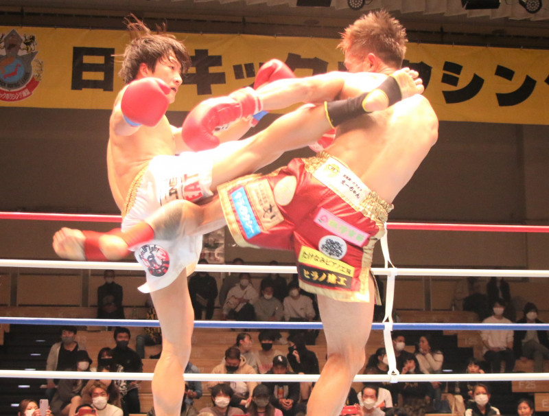 杉山(左)がミドルキックで則武を攻略した