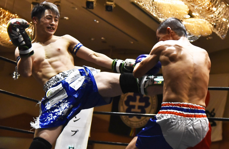 JAN(右)に左ミドルを見舞う角田(左)