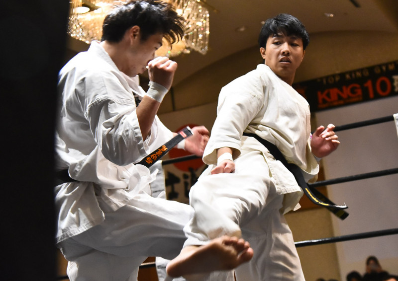 山田(右)が西田(左)に右下段蹴りを見舞う