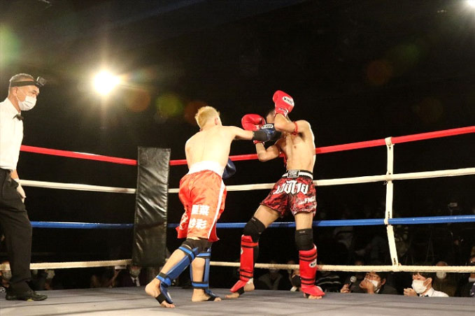 3Rロープに追い詰めた宮城の右ストレートがヒット。