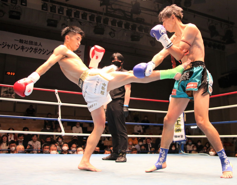 岩浪(左)は日下(右)を蹴りとパンチのコンビネーションで追い込んだ