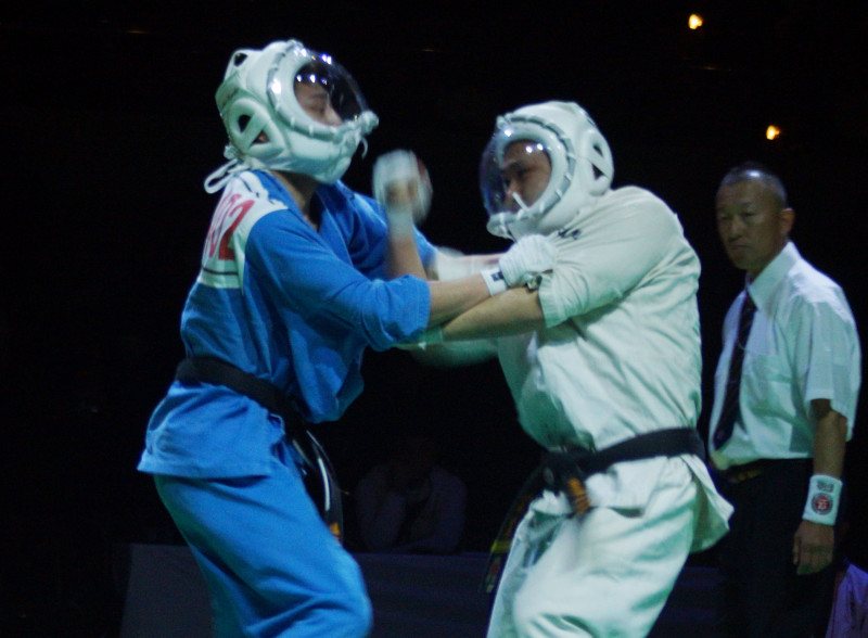 組み技を狙って掴む遠藤を伊東の右アッパーが突き上げる