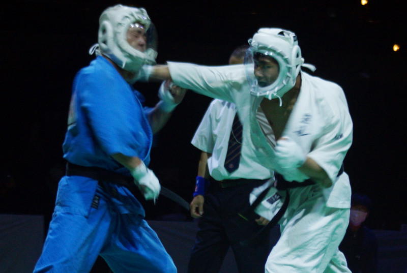 右ストレートで佐川のアゴを捕える寺阪(右)