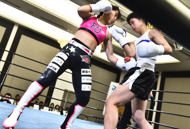 奥村琉奈(右)に左ボディを見舞った風羽(左)
