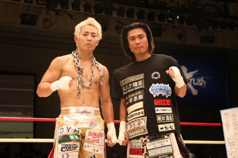 璃明武の怪我でKrushスーパー・バンタム級タイトルマッチが中止となり、永坂吏羅(右)が大岩龍矢(左)とエキシビションマッチを行った