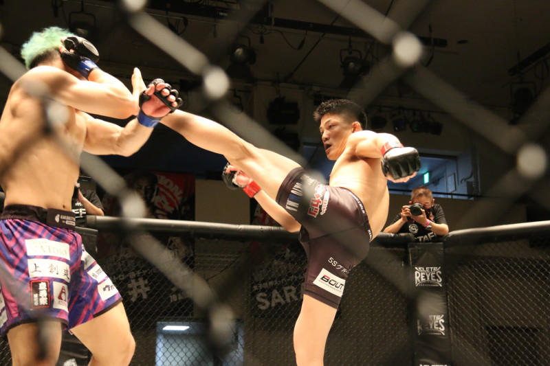 左の蹴りを放つ後藤(右)
