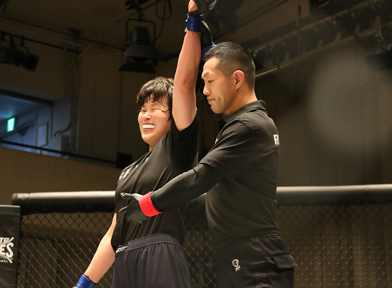 勝ち名乗りを受ける緒方、笑顔で勝利を喜んだ