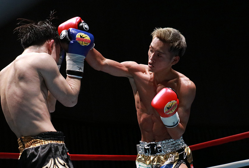 神助(右)が鋭いパンチを振るう、山田航暉(左)に判定勝利