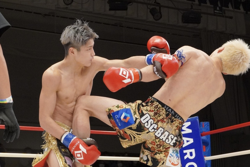 伸びる左ストレートを放つ久井(左)