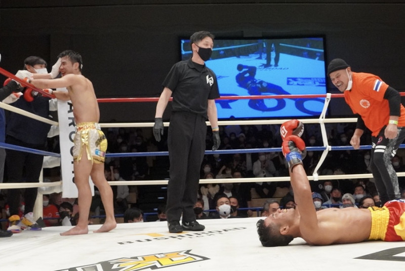 小笠原(左)が手当を受ける、チャーパヤック(右)が仰向けになって勝利を喜ぶ