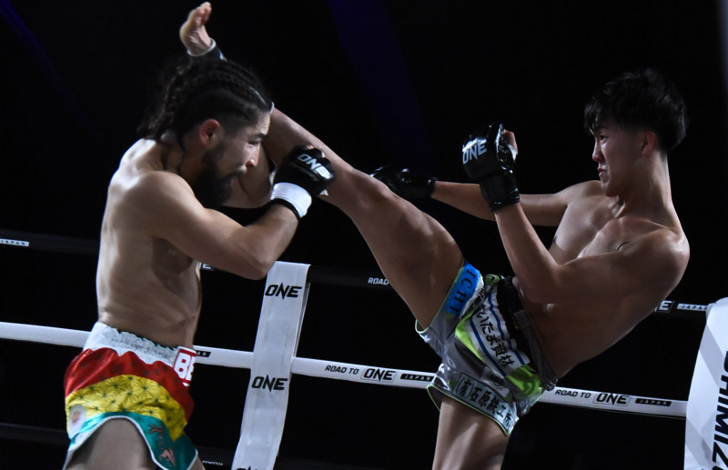 Gang-G(左)に右ハイを見舞う馬渡(右)