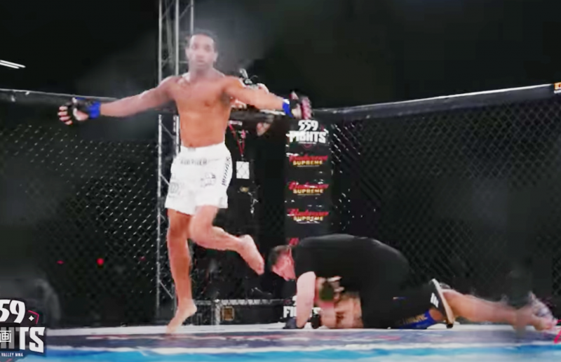 わずか6秒、エチオピアのシブレがハイキックで相手のマウスピースを吹き飛ばした。この後ケージに上りジャンプ、バック宙を決めた(559Fight YouTubeより)