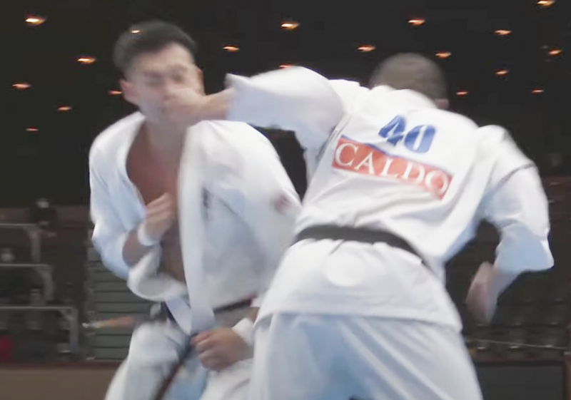 ヒザ蹴りの打ち終わりに顔面にヒット(新極真会Youtubeより)