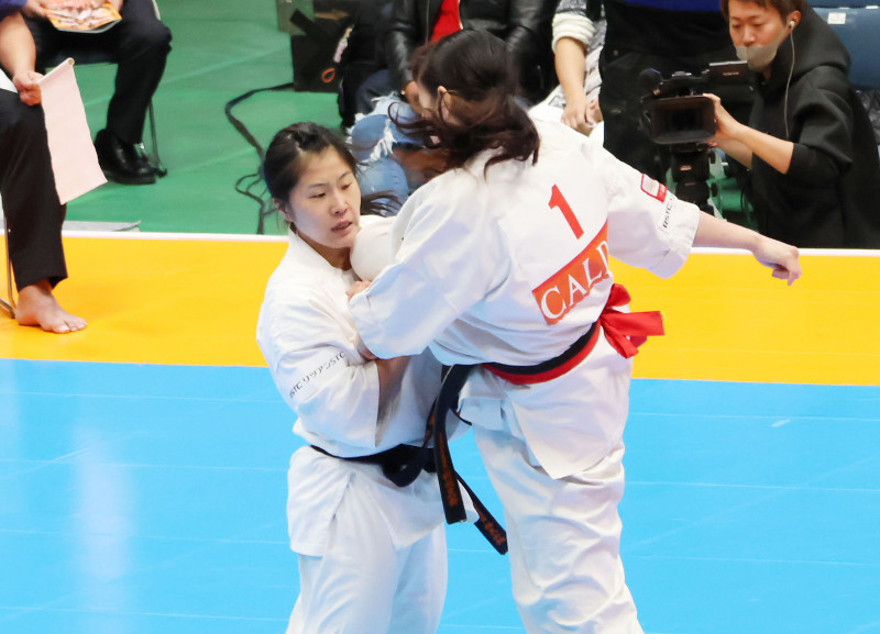 鈴木が上段ヒザ蹴りを浅古麗美にヒットさせる。延長5-0で勝利